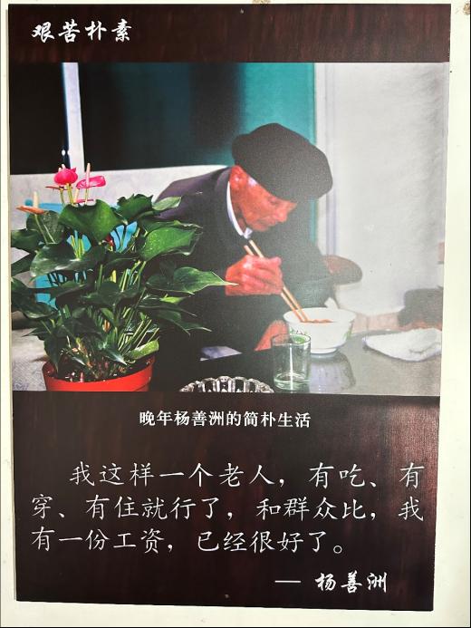 一间简陋的窝棚,一排残缺的栅栏,一口清澈的老井,一盏生锈的油灯,陈列馆中的老物件默默地诉说着杨善洲生前清廉朴素的生活。穿行在杨善洲生活和工作的一幕幕场景中,杨善洲让荒山变绿的坚守和执着变得生动起来,“绿了荒山,白了头发,他志在造福百姓;老骥伏枥,意气风发,他心向未来。清廉,自上任时起;奉献,直到最后一天。六十年里的一切作为,就是为了不辜负人民的期望。”杨善洲同志从不为名誉和权力所困、不为金钱和俗物所累,克己奉公、廉洁为民是他秉持一生的无私信念。