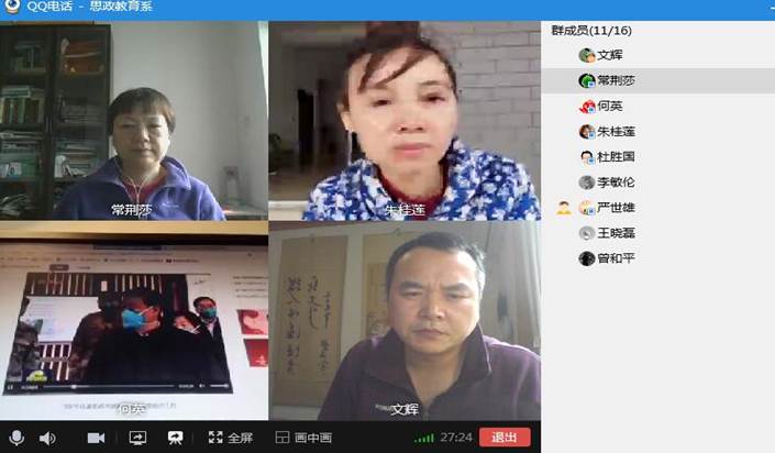 【思想政治教育系党支部】全体党员唱国歌,重温入党誓词。在集中学习习近平总书记系列讲话后,观看了总书记调研视频报道,深化对习近平“我们党在内忧外患中诞生,在磨难挫折中成长,在攻坚克难中壮大。”的讲话精神理解,重温了总书记和党中央对各级党组织和广大党员、干部要不忘初心、牢记使命,扛起责任、经受考验,在这场大考中磨砺责任担当之勇、科学防控之智、统筹兼顾之谋、组织实施之能,做到守土有责、守土有方的工作要求。通过此次主题党日学习,强化了在抗击新冠肺炎疫情的关键时刻的工作认识,对保持头脑清醒,慎终如始,再接再厉、善作善成,不麻痹、不厌战、不松劲,毫不放松抓紧抓实抓细各项防控工作,为坚决打赢湖北保卫战、武汉保卫战各尽其职的信心。最后与会全体党员对思政系下一步的党建工作以及教学工作进行讨论和安排。特别是当前要抓紧敦促指导老师和毕业生完成毕业论文尽快提交初稿,以及做好部分转专业学生的疏导工作。