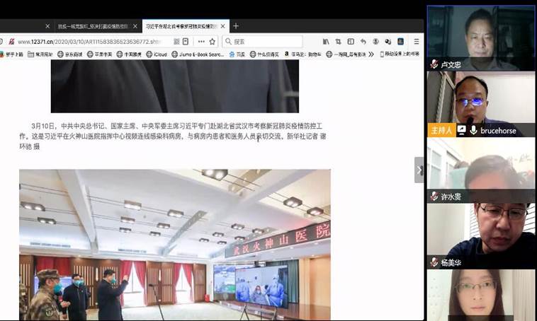 【心理所党支部】通过学习,党员们认为目前湖北和武汉疫情防控工作取得阶段性重要成果,但疫情防控任务依然艰巨繁重,作为共产党员,更要保持头脑清醒,慎终如始,冲锋在前,以自身行动,落实落地党中央相关决策部署,坚决打赢湖北保卫战、武汉保卫战;“到2020年现行标准下的农村贫困人口全部脱贫,是党中央向全国人民作出的郑重承诺,必须如期实现”,作为党员,要不忘初心、牢记使命,作为教职工党员,更要发挥工作岗位的特长和优势,努力推进脱贫攻坚。心理所全体党员同志均有心理学的学科背景,以多种形式参与了不同层级疫情防控的心理服务工作。最后,大家分享了各自在疫情防控过程中工作和学习内容、途径以及相关的报道等,对疫情防控工作先进事迹进行了学习。