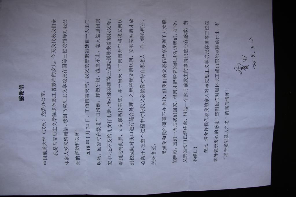 信是由beat365退休职工曾繁治的女儿曾田写的。信里对beat365张存国、阮一帆、严世雄等同志在2018年寒假看望离退休职工途中,遇到其父亲摔伤后立即送往医院救治表示了感谢!对学院关爱离退休教职工表示感谢!