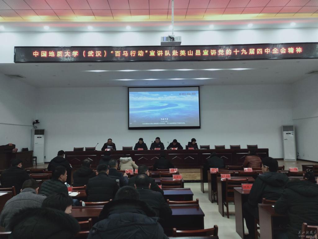 1月15日,中国地质大学(武汉)“百马行动”宣讲队一行6人冒着雨夹雪,来到湖北省“理论热点面对面”示范点——英山县开展党的十九届四中全会精神宣讲活动。