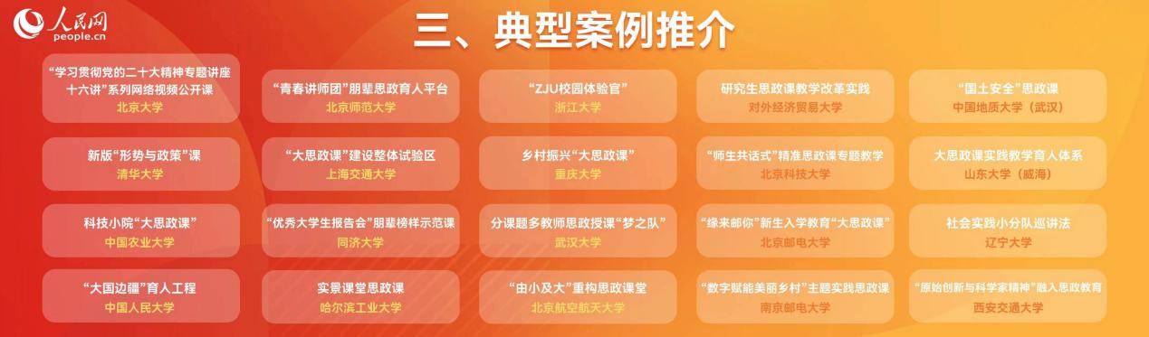 作为国家级大型年度教育论坛,人民网主办的大学校长论坛已成功举办十届,累计600余位大学书记、校长参加研讨,成为凝聚共识、助力中国高等教育改革与发展的年度盛事。《2023年高校思政课改革创新情况分析报告》根据各高校思政课程的社会反响、信息传播量、主流媒体关注度、舆论反馈情况等维度,在全国征集推介“北京大学‘学习贯彻党的二十大精神专题讲座十六讲’系列网络视频公开课”“清华大学新版‘形势与政策’课”“中国人民大学‘大国边疆’育人工程”“中国地质大学‘国土安全’思政课”等20个优秀思政课程案例,以期为各高校思政课改革创新提供借鉴启示。