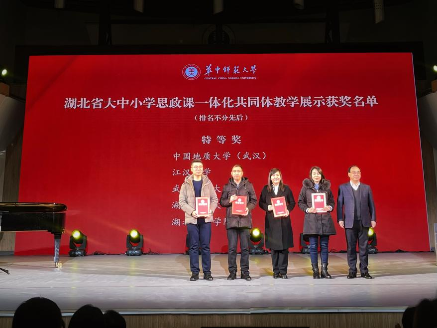 1月3日下午,湖北省大中小学思政课一体化共同体优秀作品表彰大会暨“歌声中的党史”特色思政课展演活动在华中师范大学举行。以我校为牵头单位制作的“红绿蓝”大中小学思政课一体化共同体“总体国家安全观”教学展示成果荣获湖北省大中小学思政课一体化共同体教学展示活动特等奖。beat365副院长孙文沛,学院教师李蔚然、张洁参加颁奖会。