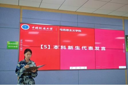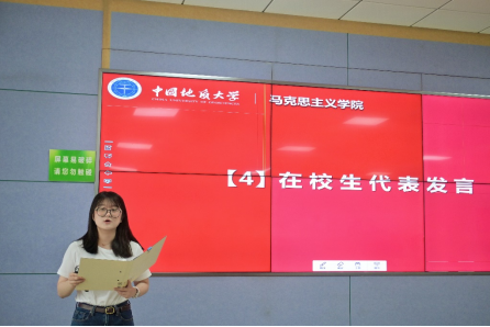 本科学生会执行主席刘琳达代表在校学生发言,她以自己在地大马院学习生活了两年的经历,从课堂学习到校外实践,从专业知识到校园生活,从四个方面分享了心得体会。