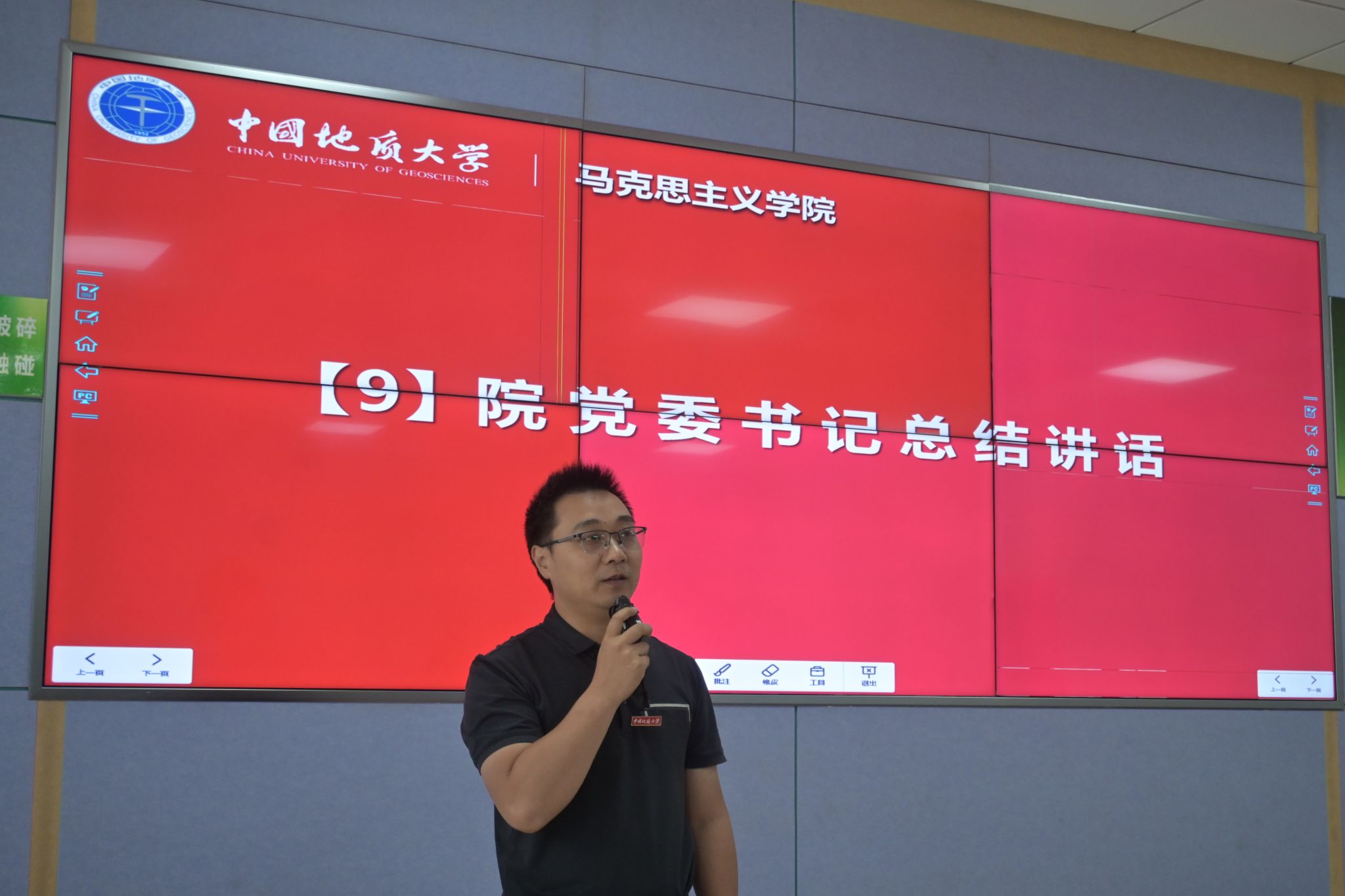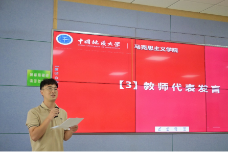 思政系青年教师曹阳作为教师代表发言。他回顾十四年马院学习工作生涯,感慨万千,借此机会与各位同学分享共鸣。第一,要心怀感恩之心,回顾在地大的十四年,他个人的成长发展受益于伟大时代的发展,获益于地大“艰苦朴素,求真务实”校训精神的熏陶,也得益于学院领导的关心与支持。第二,要胸怀报国之志,珍惜在校期间的学习机会,努力成长为有理想,有担当的新时代好青年。第三,要永怀敬畏之心,坚持学以致用,学思悟透,熟练掌握马克思主义立场观点方法。第四,要常抱奋斗之志,奋斗是青春最亮丽的底色,以奋斗之力激昂青春,努力把个人成才与国家发展融为一体。