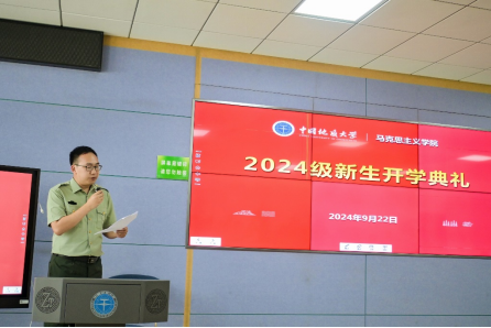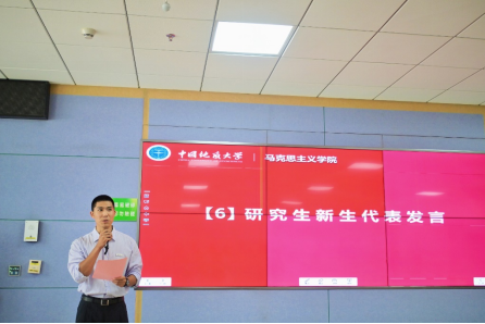 研究生新生代表吴恺文发言。他分享了自己的两段宝贵经历,在原创话剧《大地之光》中扮演李四光先生的经历和作为研究生支教团成员前往云南楚雄支教的经历让他重新审视了自己和教育的关系,思考培养什么人,怎么培养人,为谁培养人的问题,筑牢理想信念,立德树人,思考自己能为学院学校乃至社会做出哪些贡献。